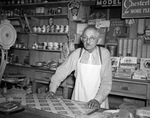 Louis Haberzettle, grocer who still operates old-fashioned store established by his father in 1888 at 1305 E. Lancaster Ave., Fort Worth, 05/31/1939. Louis is standing behind the counter wearing an apron and glasses.