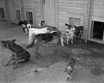 Tenants of a free dog exchange owned by W. J. Elkin at 2910 East Belknap, Fort Worth; puppies and dogs will be given away during National Dog Week, 05/31/1939. There is a fence , on one side of the fence there is one dong on the other side there are eight dogs.