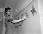 Beth Lea, art student at Texas Christian University (T. C. U.), paints a mural of people on horses in the English office at Texas Christian University (T. C. U.); she works as a showgirl and office worker at Casa Manana to pay for college, 06/03/1939