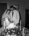 Newlyweds Ki Aldrich and Dorothy Pope, he of Texas Christian University (T. C. U.) football fame, cut the wedding cake, 06/06/1939