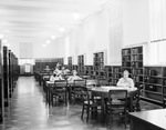 Mrs. Ellet Crowley, filing clerk at the first table in the general reading room of the new Fort Worth Public Library; Alma Smith and Marion Jones are at the second table and Edward F. Greve and Mrs. Greve are at the third table.