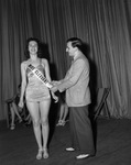 Margaret Lou Hopkins, age 15 and junior at Cleburne High School, crowned winner by Lou Wolfson, executive director of Fort Worth's Casa Manana, in Miss Cleburne beauty pageant.