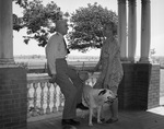 Mr. and Mrs. J. J. Woody on porch with their dog at their 300-acre farm in Wise County where Mr. Woody spends his summers. Mr. Woody is 35-year employee of the W.C. Stripling Company in Fort Worth.