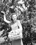 Betty Young of Weatherford, a student at Texas Technological College, picking peaches in Parker County, 06/13/1939
