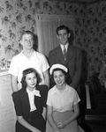 Herbert Wallace of Fort Worth (back right) was host to house guests from Ardmore, Oklahoma; front, from left, Theda Harrell and Katherine Cruce; back, left, Chappy Cook. They can all be seen in a living room, there is a piano to the right, the two ladies are sitting down, and the two men are in the back.