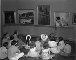 Mrs. Jane Harrison, art appreciation teacher at Stephen F. Austin Elementary School, conducts first of series of art lectures at the new Fort Worth Public Library, group of children seated on floor
