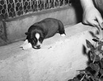 At Fort Worth's Forest Park Zoo, a new baby Alaskan husky dog sits near Zookeeper Hamilton Hittson, 06/29/1939