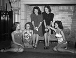 Talent at Casa Manana, Texas Sweetheart Number 1 candidates; from left, Louise Mariquine (Galveston), Dorothy Henry (Ranger), Ollie Sue Armstrong (Lubbock), Marjorie Jo Massey (Abilene), Ben Nalley (Waco). They are seated at the fireplace with Ollie and Marjorie seated on wood logs and the rest are seated on the floor, 07/01/1939.