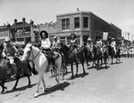 Opening parade at 10th annual Texas Cowboy Reunion in Stamford; cowgirls and cowboys on horse back, 07/03/1939