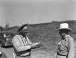 Frank Reeves presenting a six shooter, provided by Paul Whiteman, to Charles E. Coombes of Stamford at 10th annual Texas Cowboy Reunion and Rodeo, Stamford, 07/05/1939