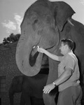 At Forest Park Zoo, Fort Worth, Zookeeper Hamilton Hitson feeds Queen Tut the elephant an ice cream cone during a 106-degree heat wave, 07/08/1939