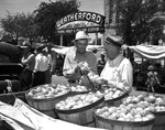 At Trading Day in Weatherford, G. A. Holland (right), Weatherford banker and former mayor, inspects Hart cling peaches being sold by J. A. Melton who owns an orchard 11 miles northwest of town, 07/08/1939