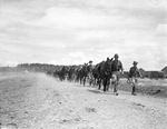 During Fifty-sixth Cavalry Brigade maneuvers at Camp Wolters, Mineral Wells, men dressed is uniforms leading their horses for a scheduled rest, 07/13/1939. Wood buildings can be seen in the background with a wagon.
