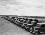 During military maneuvers at Camp Wolters, Mineral Wells, transport trucks are lined up on the camp grounds, each carries eight men, 07/13/1939