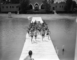 At the Panther Boys 10-acre camp at Lake Worth, group of children/campers running toward the lake for a swim, 07/14/1939. There is a brick building in the background with three arches and eight windows.