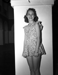 A photograph of Betty Davison, the shortest of the Casa Manana chorus girls at 5 feet tall, wearing a dress. She also runs a taxi service to rehearsals for other performers.