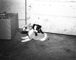 Jo Jo Louis, a toy bull terrier, climbs over a fox terrier at the free dog exchange at 2910 East Belknap, Fort Worth, owned by W.J. Elkin who needs medicine, food and more shelters for his homeless tribe, 07/20/1939