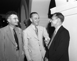 Preview night at Casa Manana; from left, Vann Kennedy, International News Service in Austin; Paul Wakefield, Texas World's Fair Commission; and W. C. Repass, managing editor of the Houston Chronicle newspaper. The men are standing and having a conversation. They are dressed in suits and ties, 07/20/1939.