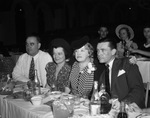 Preview night at Casa Manana; in the audience, from left, Raymond Wiley, Interstate Theaters, Inc.; Mrs. Stuart Scruggs; Mrs. O'Donnell; and Stuart Scruggs, all of Dallas. They are seated at tables with food and drinks in front of them as they watch the show. There are other people watching in the background, 07/20/1939.