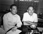 Preview Night at Casa Manana; from left Abe Lastfogel and Louis Epstein, manager of Casa Manana for the William Morris Agency. A tea cup, silverware, salt and pepper can be seen on the table. There are more tables in the background.