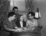 Casa Manana band leader Russ Morgan marries Shirley Gray; Tarrant County Clerk Happy Shelton (left) with marriage license and Lou Wolfson, Casa Manana producing director, is witness.