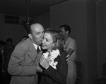 John Farrell kisses Mrs. Russ Morgan, the former Shirley Gray who just married Casa Manana band leader Russ Morgan, 07/21/1939