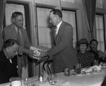 Appreciation luncheon for Sweetwater's City Manager Sam H. Bothwell who will become City Manager in Fort Worth; former Mayor D.A. Clark presents Bothwell with silver tea service.