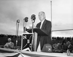Walter D. Cline of Wichita Falls, Deputy Imperial Potentate, at the speakers stand, Texas Christian University (T. C. U.) stadium, for the Americanism rally, sponsored by the Shriners, 07/28/1939