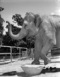 At Fort Worth's Forest Park Zoo, the elephant Queen Tut enjoys her 19th birthday party from the elephant pen, 08/12/1939