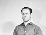 Photograph of Amon Carter Jr. made for his press card. Carter is wearing a striped button-down shirt.