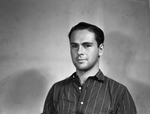 Photograph of Amon Carter Jr. made for his press card. Carter is wearing a striped button-down shirt.