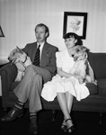 Maestro Ray Noble, who takes over the Casa Manana bandstand succeeding Abe Lyman, with his wife and two dogs, Major and Minor. They can be seen sitting on a couch in the living room, Mrs. Noble is wearing a white dress, and Mr. Noble is wearing a checkered suit, the dogs are with them.