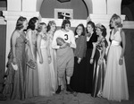 On Casa Manana's College Night, costumed Byron Gernsbacher entertains The Fair's College Council, from left, Ann E. Evans, Nancy Anderson, Jerry Goodrich, Elizabeth Hager, Mary Lake, Ann Ward, Jane Taylor, and Josephine Kennady, 08/17/1939