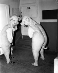 A new Casa Manana Revue includes Margaret Hopkins (of Cleburne, left) and Viola Welch (of Kilgore) dressed as pigs, 08/17/1939. Back stage setting at Case Manana theater. A door can be seen labelled 9A.