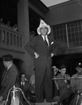 Comedian Eddie Cantor, wearing a Fort Worth Fire Department hat, climbs onto a fire truck that he will ride from the Texas and Pacific Train Station in Fort Worth to the Hotel Texas; he will perform at Casa Manana for one week, 08/22/1939