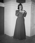 As seen in The Fair Store's fashion revue at Casa Manana, sponsored by Fort Worth Florists' Club, Betty Beggs Bevan in red pepper dinner dress worn with gold belt and multi-colored turban, 08/23/1939