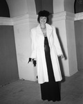 As seen in The Fair Store's fashion revue at Casa Manana, sponsored by Fort Worth Florists' Club, Margaret Shaw in white ermine coat over black velvet period gown trimmed in white lace, 08/23/1939