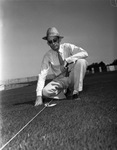 Lighting at new Farrington Field, Fort Worth's high school stadium; Orville White, city schools electrician, marks spots on field where lighting will focus, 08/25/1939