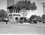 Fort Worth's Park Department campaign to reduce traffic hazards; workmen haul shrubs away from entrance to Forest Park at Forest Park Boulevard, 08/30/1939