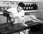 Boss, the English bulldog that belongs to J. P. Little, having porcupine quills removed from his mouth by a Mercy Animal Hospital attendant; the stray porcupine was given to the Forest Park Zoo, 09/12/1939