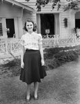 Ruth Carter. In the photograph, Ruth is wearing a white collared top and a skirt. She is standing outdoors in front of a building. She has her hands to her side and is posing as she smiles for the camera. She is under a tree and there are little bushes behind her.