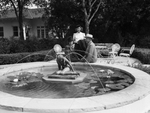 Amon Carter Senior and two women pictured around a fountain outside the Carter Home in Rivercrest.