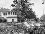A photograph of the grounds and exterior of the Amon Carter family home in Rivercrest. There is a fountain in the foreground surrounded by vegetation. The façade of the house is obstructed partially by a large tree.