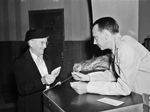 Mrs. F. W. Axtell, 78, at Fort Worth's Municipal Airport buying her first airplane ticket; she'll fly to Chicago to visit relatives.