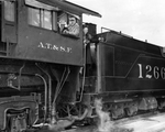 A photograph of Amon G. Carter, Sr. (center) and an unidentified man and unidentified woman looking out the window of an Atchison, Topeka and Santa Fe Railway (A. T. & S. F.) train's engine car.