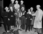 Ranch Girls en route from New York. Amon Carter, right, giving hats to the girls. Back row, left to right, Elizabeth Miller, Fluvanna; Peggy Minnick, Crowell, and Anna Bell Edwards, Big Spring. Front row Walter Fay Cowden, Midland; Mrs. M. M. Edwards. Big Springs, Mrs. U. D. Sawyer, Cross Roads, N. M. ; Fay Marburger, Abilene, Fern Sawyer, Cross Roads, N. M, and Mary Nell Edwards, Big Spring. The girls are wearing the hats. Some of them are dressed in pants and a shirt while others are wearing skirts and dresses. Amon Carter is wearing an overcoat on his collared shirt and tie. He is giving a hat to one of the girls.