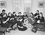Members of the Fort Worth Council of Jewish Women knitting socks, sweaters, and caps for Polish refugees and other war sufferers. Clipping reads "Socks and sweaters and warm caps for Polish refugees and other war sufferers, for whom the Red Cross is assigned a clothing quota, will result from this knitting party. Members of the Council of Jewish Women are, from left in semi-circle, Mrs. I. E. Horwitz, Mrs. J. Stern, Mrs. H. H. Miller, Mrs. Gus Landman, Mrs. Irving Klotzman, Mrs. L. Gernsbacher, Mrs. A. Gernsbacher, and Mrs. Max Gilbert. Left, behind the group, is Mrs. I. Davidson, 1933 Berkeley Place, hostess to the group. Center, on the floor, is Mrs. Ernest Marx of San Francisco. They plan to sew once a week for the war victims." Published in the Fort Worth Star-Telegram evening edition, December 14, 1939.