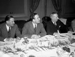 Mr. Carter's 60th Birthday Party. Postmaster Henry D. Young, right, Raymond Buck, center. The men are seated at table with plates of food and drinks. There is a left decoration down the center of the table. They are wearing suits and tie and are looking sideways.
