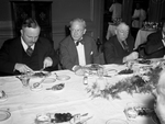 Mr. Carter's 60th Birthday Party. Charlie Benson, left, and Hal Coffman, center. The men are sitting at the dinning table and are eating food. They are wearing suits and ties. There is an unidentified man seated beside Mr. Coffman. Mr. Benson is holding cutlery in both hands and taking food from his plate while Mr. Benson is staring straight across with his head slightly turned sideways. The unidentified man is looking at his plate with his spoon in his hand.