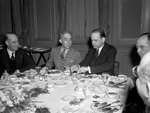 Mr. Carter's 60th Birthday Party. Ben E. Keith, center, and Hal Lattimore, right. The men are sitting at the dinning table and are eating food. They are wearing suits and ties. There is an unidentified man seated beside Mr. Keith and another beside Mr. Lattimore. They have plates of food, drinks and desert on the table. Mr. Keith is looking towards the camera while Mr. Lattimore is holding cutlery in both hands and taking food from his plate.